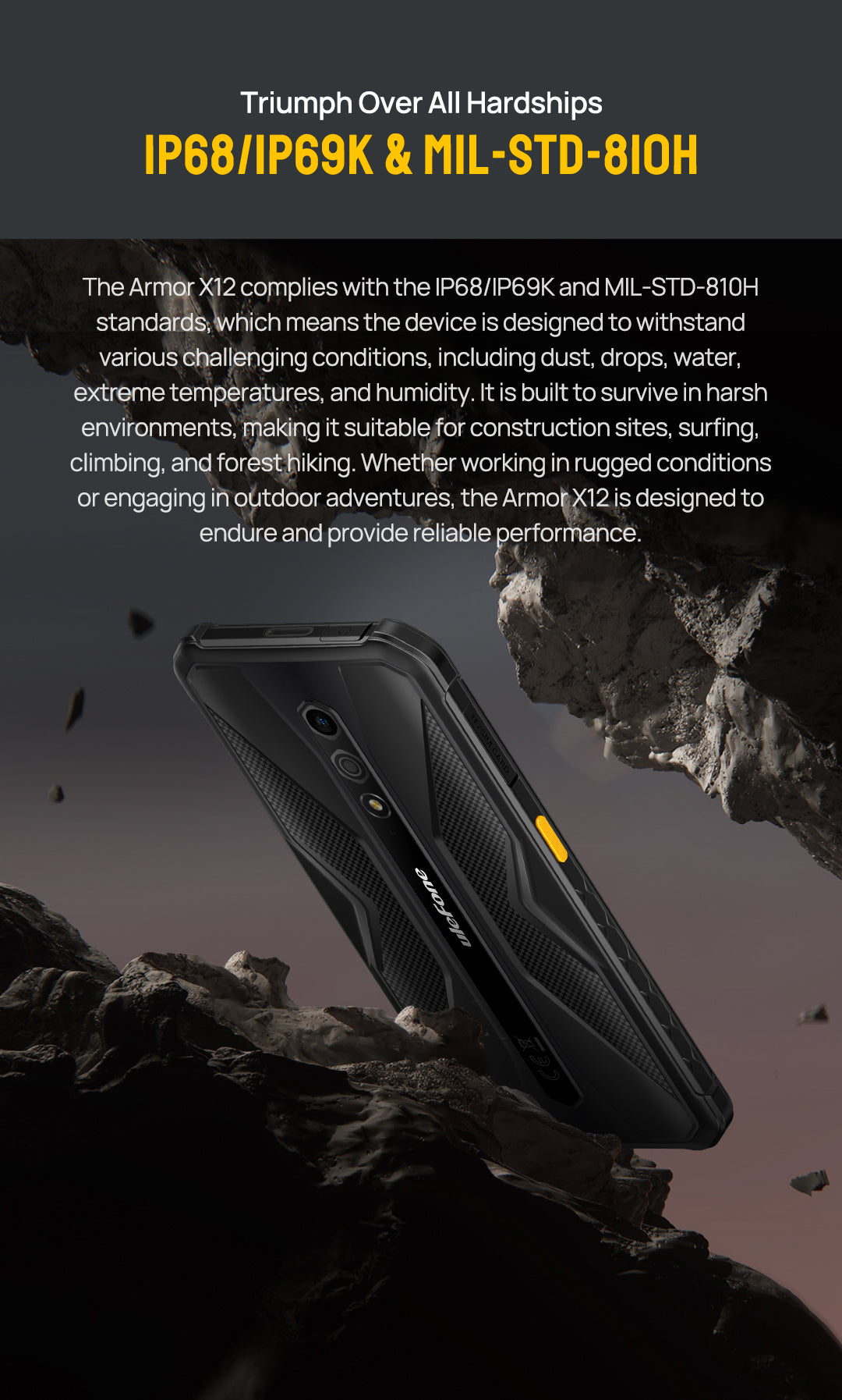 3. Armor X12 is splash, water, and dust resistant and was tested under controlled laboratory conditions with a rating of IP68 under IEC standard 60529 (maximum depth of 1.5 meters up to 30 minutes). The charger and accessories are not water-resistant. Splash, water, and dust resistance are not permanent and might decrease as a result of normal wear. Do not attempt to charge a wet Armor X12. Liquid damage is not covered under warranty.